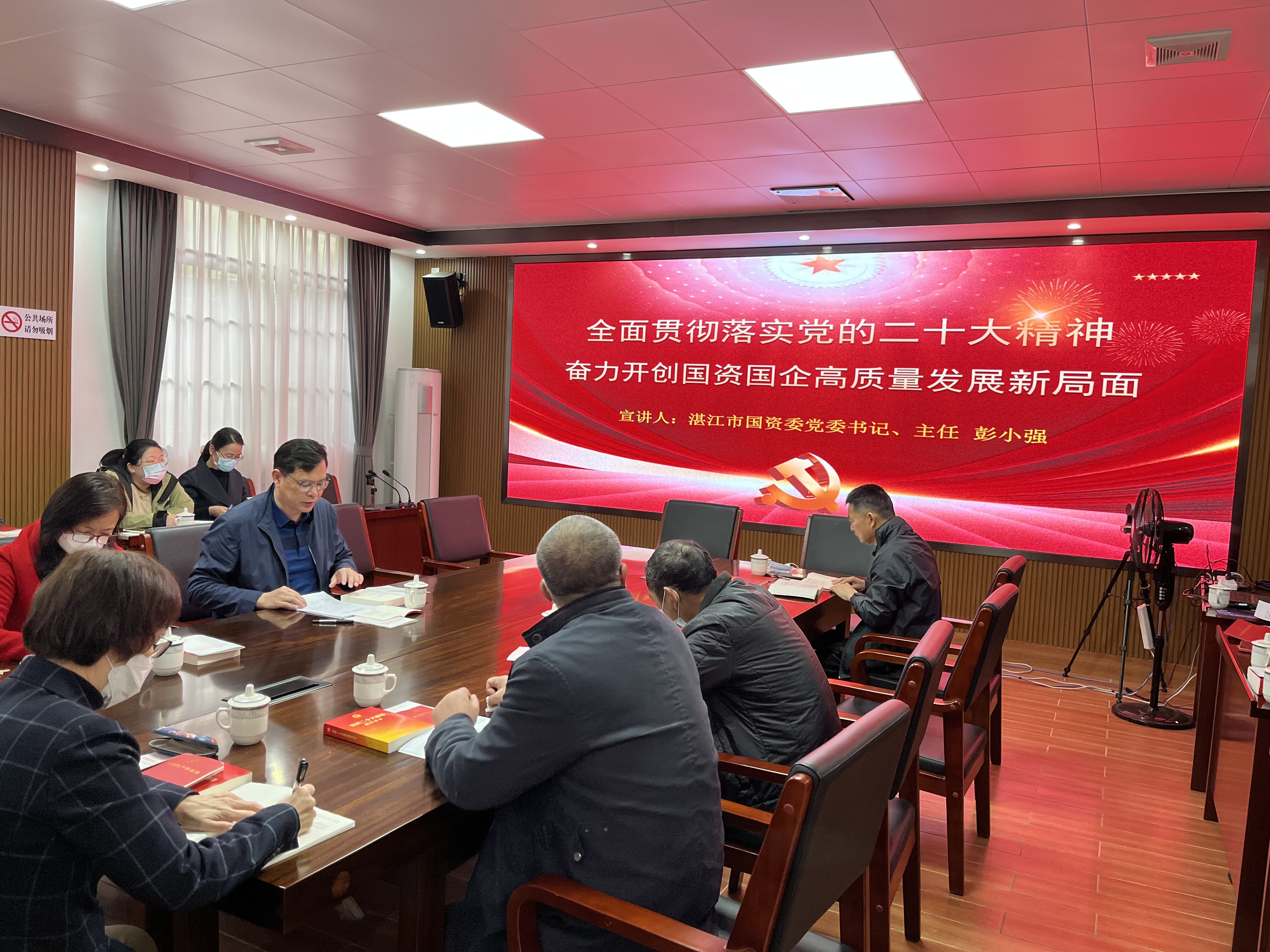 12月16日上午,湛江市国资委机关党支部召开党员大会,专题学习党的二十大精神。市国资委党委书记、主任彭小强参加会议并为全体党员作党的二十大宣讲报告。彭小强结合全市国资国企改革发展实际,以“全面贯彻落实党的二十大精神 奋力开创国资国企高质量发展新局面”为主题,重点围绕党的二十大的重大意义、过去五年的工作和新时代十年的伟大变革、开辟马克思主义中国化时代化新境界、中国式现代化的中国特色和本质要求、全面建设社会主义现代化国家的目标任务、坚持党的全面领导和全面从严治党等方面,对党的二十大精神进行了全面阐释和深入解读。