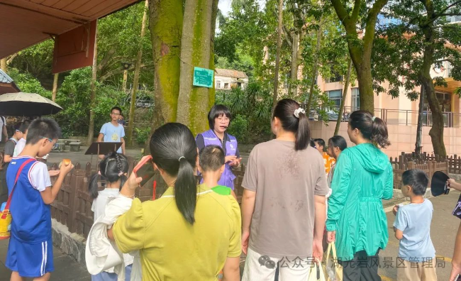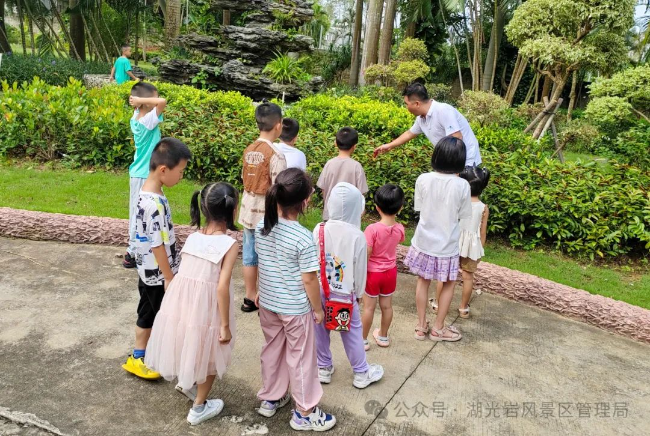 就在同一时间,湖光岩自然学校也在湖光岩风景区组织开展了“园长带你游湖光岩”公益科普活动。在学校园长的带领和讲解下,家长和孩子乘坐环湖观光车围绕湖光岩玛珥湖一圈,观赏探究了景区地质遗迹和自然景观,大家深深感受到了大自然造物的鬼斧神工,也对火山地质科学知识和植物科学知识有了更深入的了解。