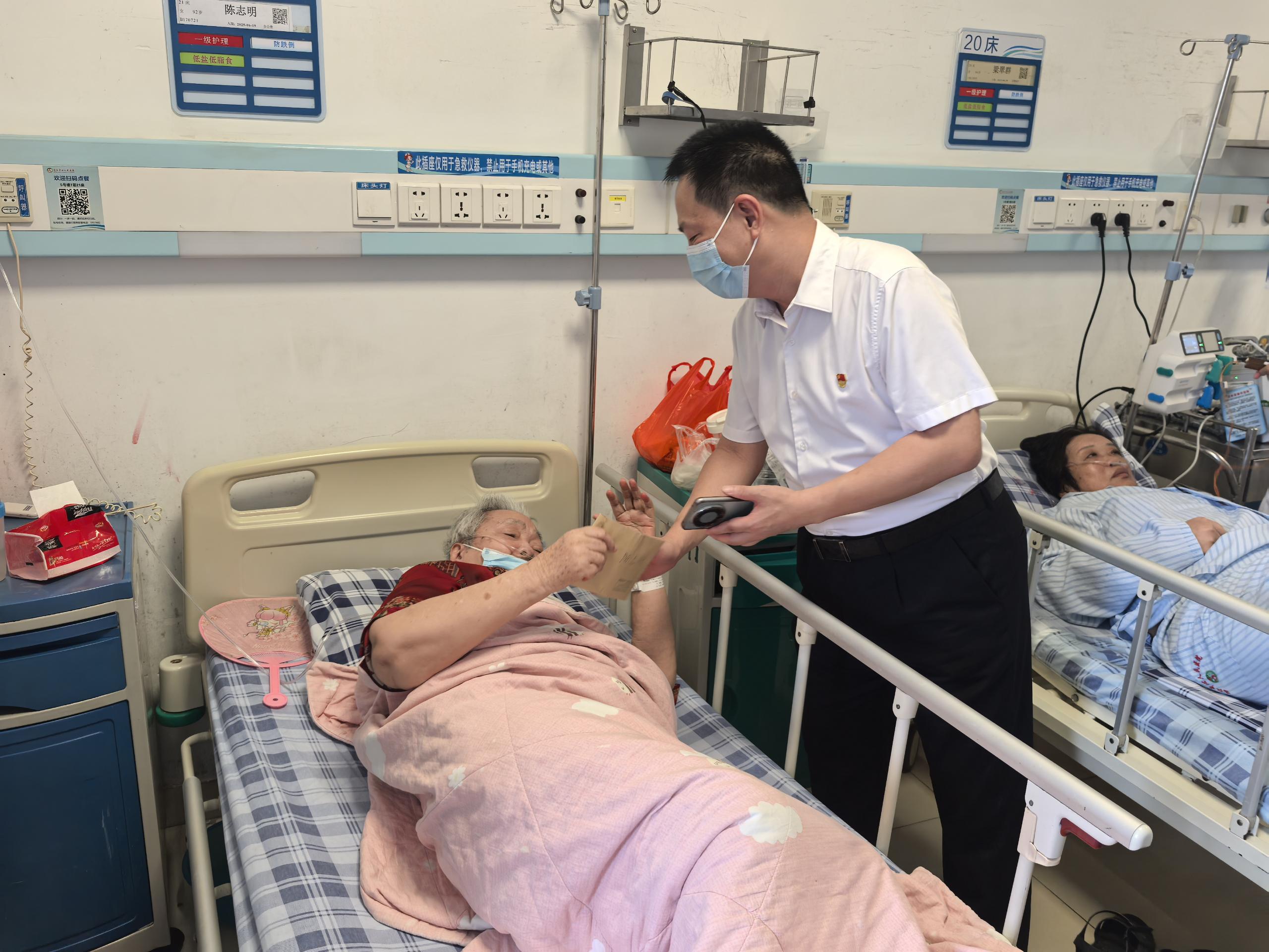 图为局党组书记、局长江强同志到湛江中心人民医院病房看望陈志明同志