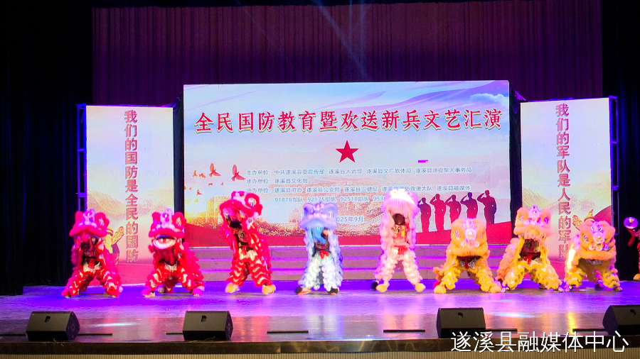 《群狮贺盛会》的上演拉开全民国防教育暨欢送新兵文艺演出的序幕。整场演出精彩纷呈,力量与美感交织相融:部队官兵带来的武术表演《武动山河》、技艺表演《烽火战旗》震撼登场,尽显刚劲风采;《龙吟醒遂》、《为你荣耀》等舞蹈、歌唱节目温情上演,传递动人情怀。刚柔并济的精彩呈现,不仅充分激发了新兵投身军旅的坚定决心,更进一步提升了全民国防意识。