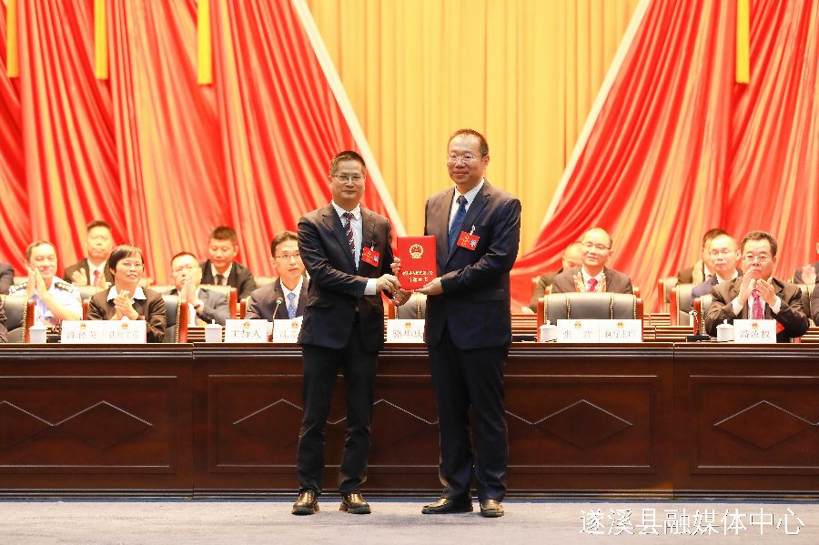 上午11时,大会举行第二次全体会议,采取无记名投票方式选举张洋为遂溪县人民政府县长。骆华庆为新当选的县长张洋颁发当选证书。