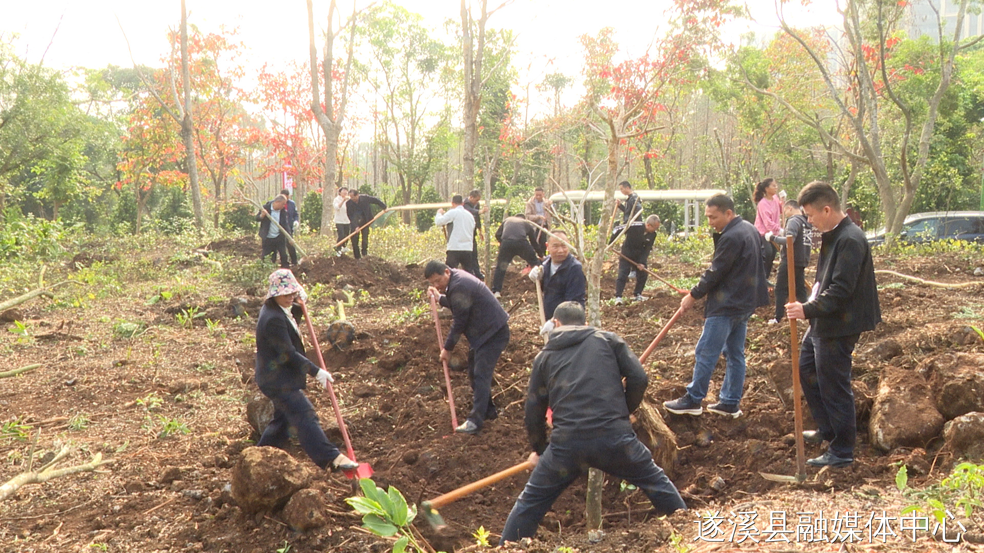 活动现场,大家分工协作,运苗入坑、扶苗正位、培土定株,种下一棵棵新苗木。经过大家的共同努力,山坡上新栽种的33棵紫花风铃整齐挺立,展现出勃勃生机,为绿美遂溪增绿添彩。大家还为树苗挂上“才聚遂溪,汇才成林”认种牌。