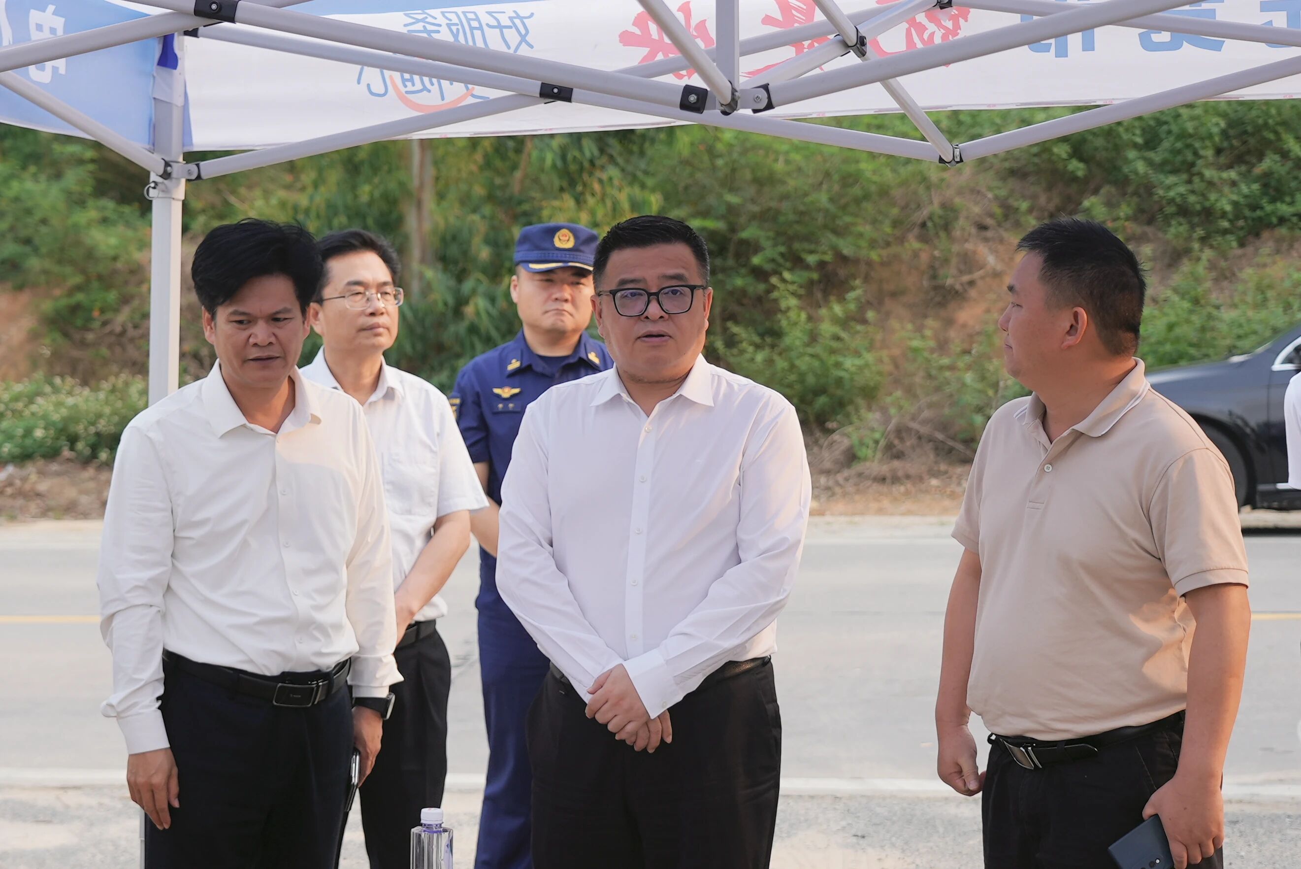 在坡头镇黄十岭、大环岭,刘剑详细查看森林防灭火物资储备、应急处置机制、重点片区巡查值守等防灭火措施落实情况,对森林防灭火工作进行再部署再动员。随后,刘剑一行来到官渡镇开展巡河工作,深入了解官渡水闸重建工程、官渡河生态修复工程的进展情况,并查看河道水质、沿岸绿化情况。