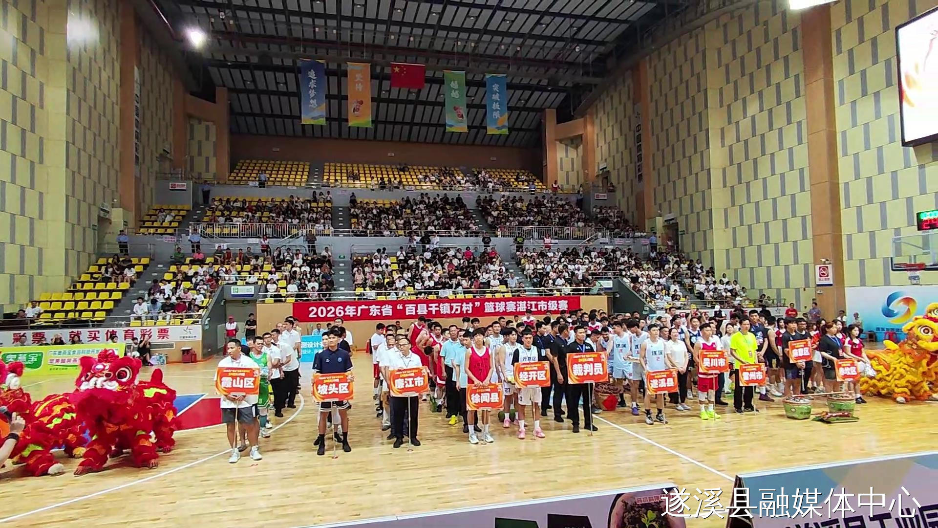 4月11日,2026年广东省“百县千镇万村”篮球赛湛江市级赛在遂溪县体育馆正式打响,来自全市10个县(市、区)的冠军代表队齐聚赛场,以球会友、同场竞技,用汗水与拼搏角逐代表湛江出征省级赛的唯一名额。