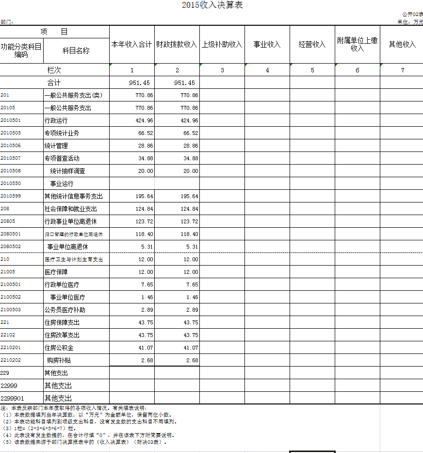 1.市统计局2015年度总收入951.45 万元,其中本年财政拨款收入951.45 万元。比上年716.50万元决算数增加234.95万元,增长32.79 %。主要原因:一是市财政局将 2013 年的“四大工程”款项目资金在 2015 年重新安排,列为当年收入;二是我局新增了工作任务, 如全国 1%人口抽样调查、统计联网直报系统升级等,而 2014 年则没有这些项目经费。