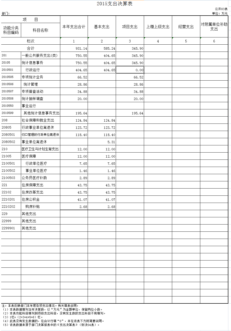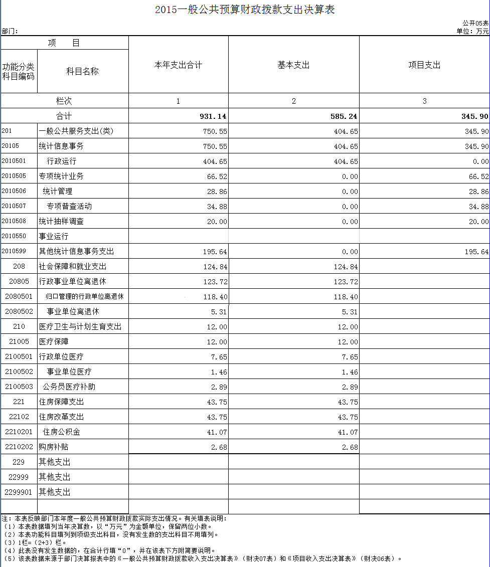 2015 年我局当年支出 931.14 万元, 比2014年713.82增加 217.32万元。主要原因:一是主要为市财政局将 2013 年的四大工程款项目资金在 2015 年支出;二是我局新增全国 1%人口抽样等调查任务,2014 年没有这些项目,所以项目支出要高于去年;三是因为人员变动及以前年度和 2015 年基本工资标准调整,相应增加支出。