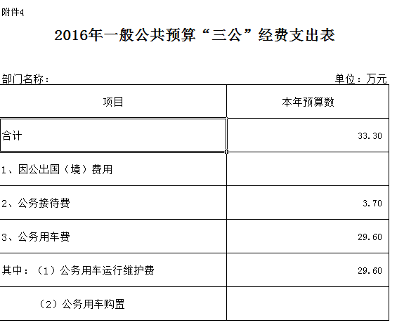 2016 年本部门“三公”经费预算安排支出33.3万余。与上年保持不变;主要原因………其中:因公出国(境)费今年预算没支出0万元,与上年保持不变;主要原因…….公务用车购置及运行预算支出费29.6万元,与上年保持不变;主要原因是严格执行上级“只减不增”规定,加大管理力度,增强节约;公务接待费3.6 万元, 与上年保持不变;主要原因是:贯彻落实八项规定,规定按照理性节约有关要求,严控公务接待开支,逐步减少“三公”经费开支