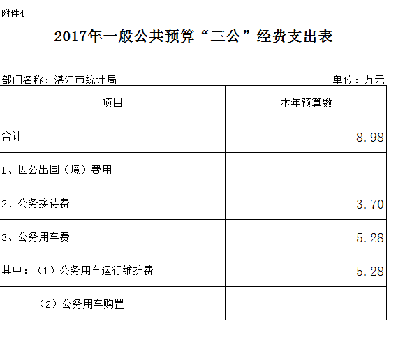 2017 年本部门“三公”经费预算安排支出8.98万。比上年度减少24.32万元,下降73.03%。主要原因是减少主要原因是严格执行上级“只减不增”规定,加大管理力度,增强节约;其中:因公出国(境)费今年预算没支出0万元,与上年保持不变;公务用车购置及运行预算支出费5.28万元,比去年减少24.32万元,减幅82.16%,减少主要原因是严格执行上级“只减不增”规定,加大管理力度,增强节约;公务接待费3.70 万元, 与上年保持不变.主要原因是: 贯彻落实八项规定,按照理性节约有关要求,逐步减少“三公”经费开支.