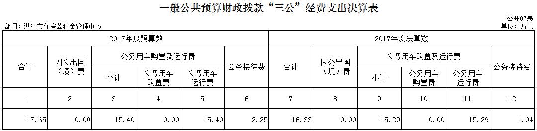 湛江市住房公积金管理中心2017 年度“三公”经费财政拨款支出决算为 16.33 万元,完成预算 17.65 万元的 92.52% 。其中:因公出国(境)费支出决算为 0 万元,完成预算0万元的 100% ;公务用车购置及运行费支出决算为 15.29 万元,完成预算 15.40 万元的 99.29% ;公务接待费支出决算为 1.04 万元,完成预算 2.25 万元的 46.22% 。