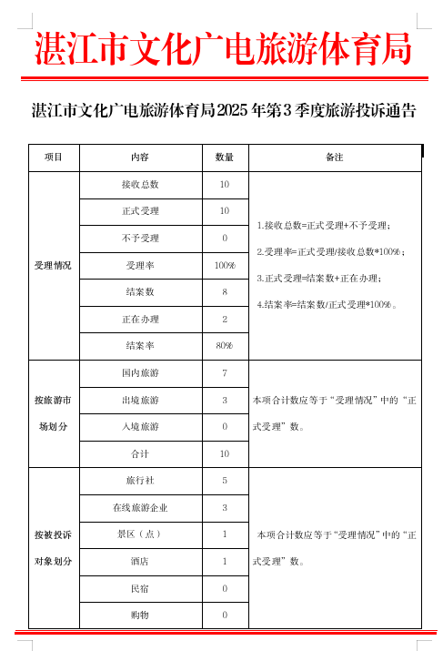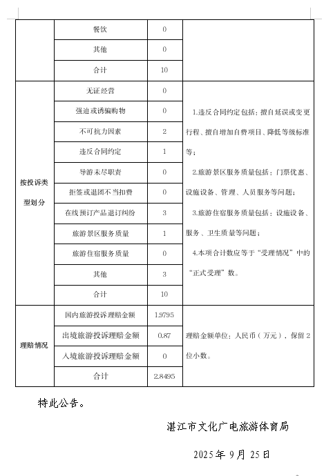 湛江市文化广电旅游体育局2025年第3季度旅游投诉通告