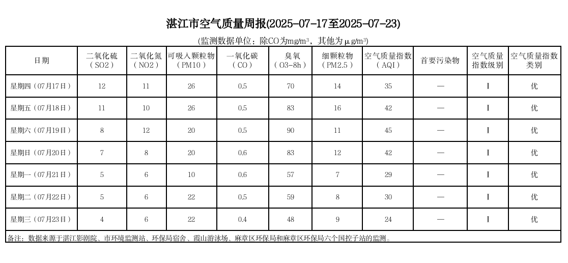 湛江市空气质量周报(2025-07-17至2025-07-23)