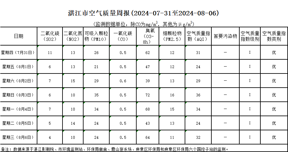 湛江市空气质量周报(2025-07-31至2025-08-06)