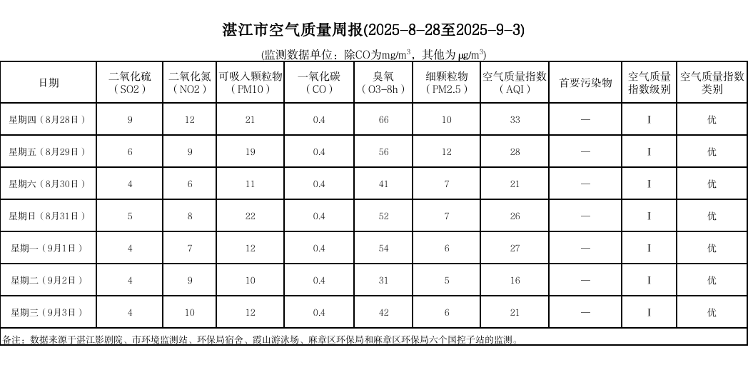 湛江市空气质量周报(2025-08-28至2025-09-03)