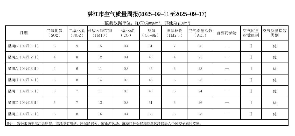 湛江市空气质量周报(2025-09-11至2025-09-17)