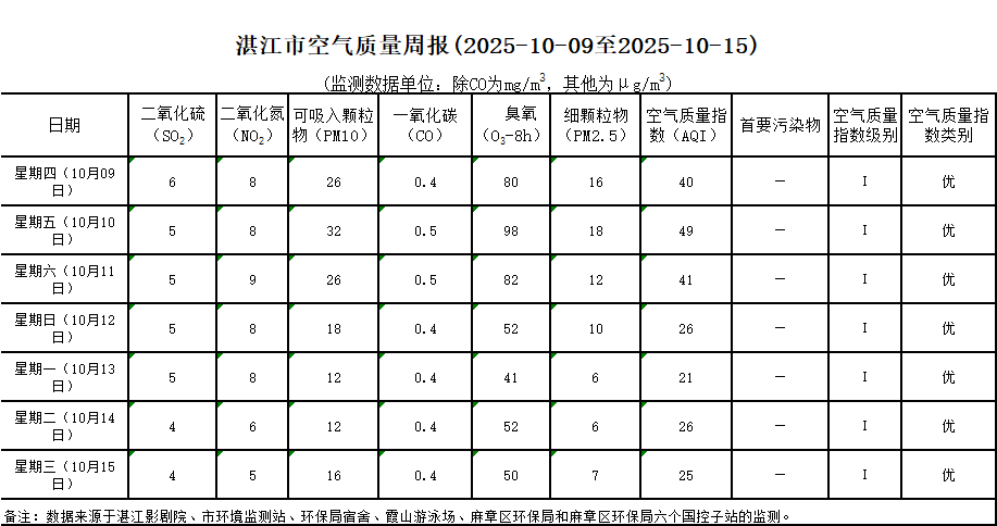 湛江市空气质量周报(2025-10-09至2025-10-15)