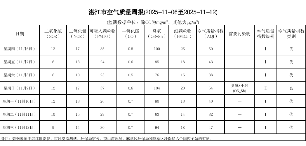 湛江市空气质量周报(2025-11-06至2025-11-12)