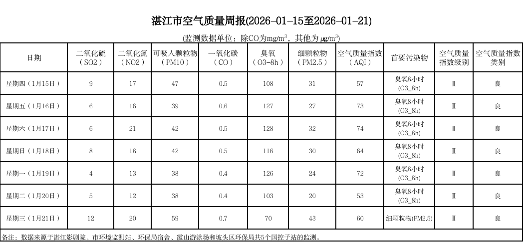 湛江市空气质量周报(2026-01-15至2026-01-21)