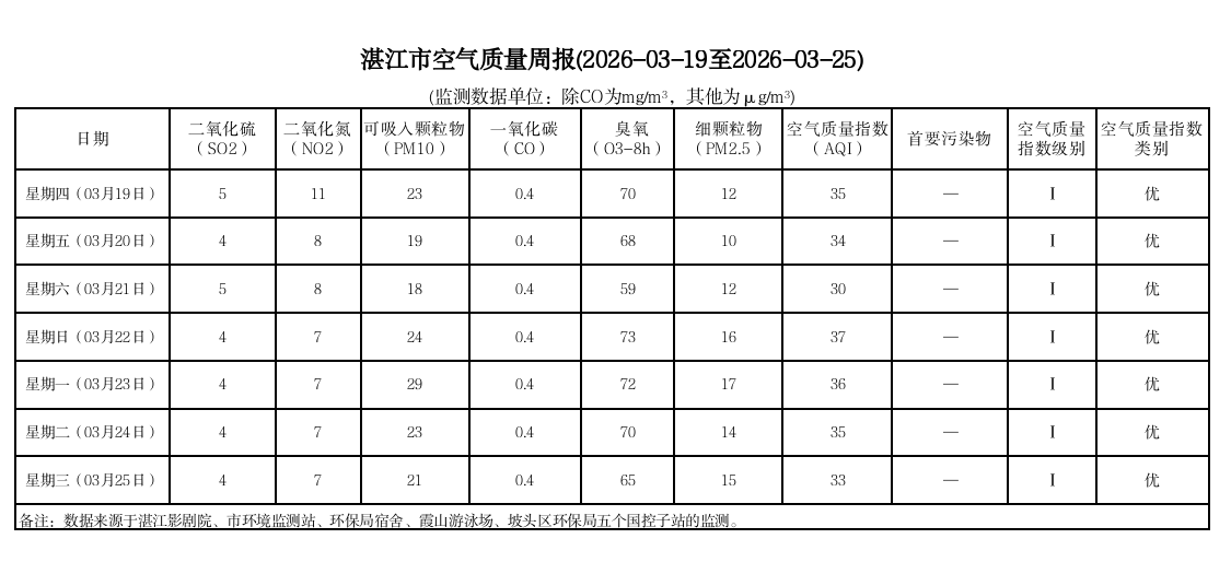 湛江市空气质量周报(2026-03-19至2026-03-25)