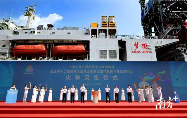 10月9日,中华人民共和国第十五届运动会、中华人民共和国第十二届残疾人运动会暨第九届特殊奥林匹克运动会火种采集仪式在广州南沙科考码头“梦想”号大洋钻探船旁举行。广东省委书记黄坤明,十五运会、残特奥会组委会主任,国家体育总局局长高志丹,残特奥会组委会执行主任、中国残联理事长周长奎,十五运会、残特奥会组委会执行主任,香港特别行政区行政长官李家超,十五运会、残特奥会组委会执行主任,澳门特别行政区行政长官岑浩辉,十五运会、残特奥会组委会执行主任,广东省委副书记、省政府党组书记孟凡利出席。