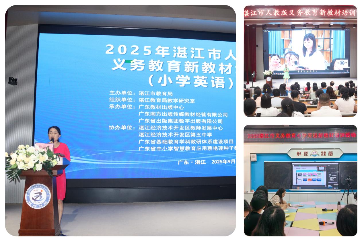 “秋光正好启新程,杏坛雅集意韵浓。”9月4日,2025年湛江市人教版义务教育小学英语新教材培训活动在湛江经开区第五中学盛大启幕。本次培训由湛江市教育局主办、湛江市教育局教学研究室统筹组织,广东教材出版中心、广东南方出版传媒教材经营有限公司、广东省出版集团数字出版有限公司联合承办,湛江经开区教师发展中心与湛江经开区第五中学协同协办,以 “线上 +线下” 双线融合模式,搭建起深耕教学、共话创新的交流平台。活动旨在用新教材为密钥,以中小学智慧平台为羽翼,聚焦学生“三个习惯”的养成教育,共同探索英语教育提质增效新路径,奏响新时代育人工作的崭新篇章。全市375名老师参加了线下的现场培训,8158人在线上观看了直播。