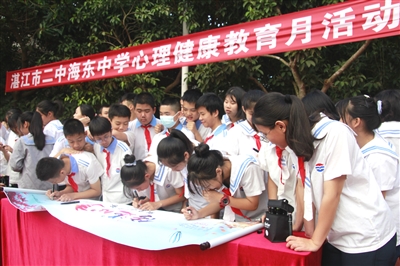 湛江市教育局因应学生心理问题多发态势,坚持生命至上,以“阳光心理,护航成长”为主题,打造未成年人思想道德建设常态化工作品牌,做细做实学生心理健康工作,培养学生积极乐观、健康向上的心理品质,促进学生阳光成长。三个“100%”守护全市学生心理健康,全市各学校100%设立心理辅导室、100%配备专兼职心理教师、100%开设心理健康教育课。