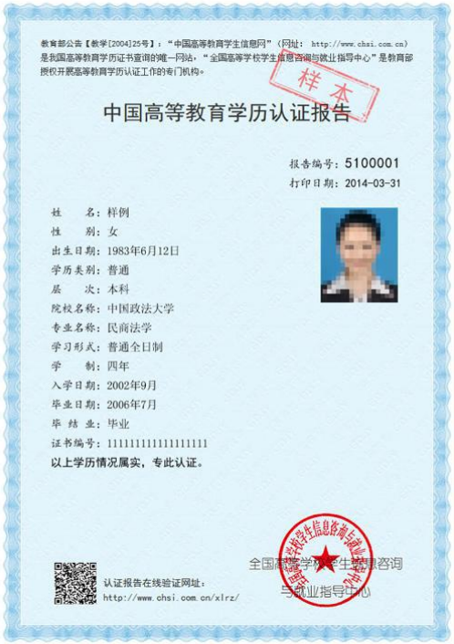 “中国高等教育学生信息网”出具的《教育部学籍在线验证报告》。