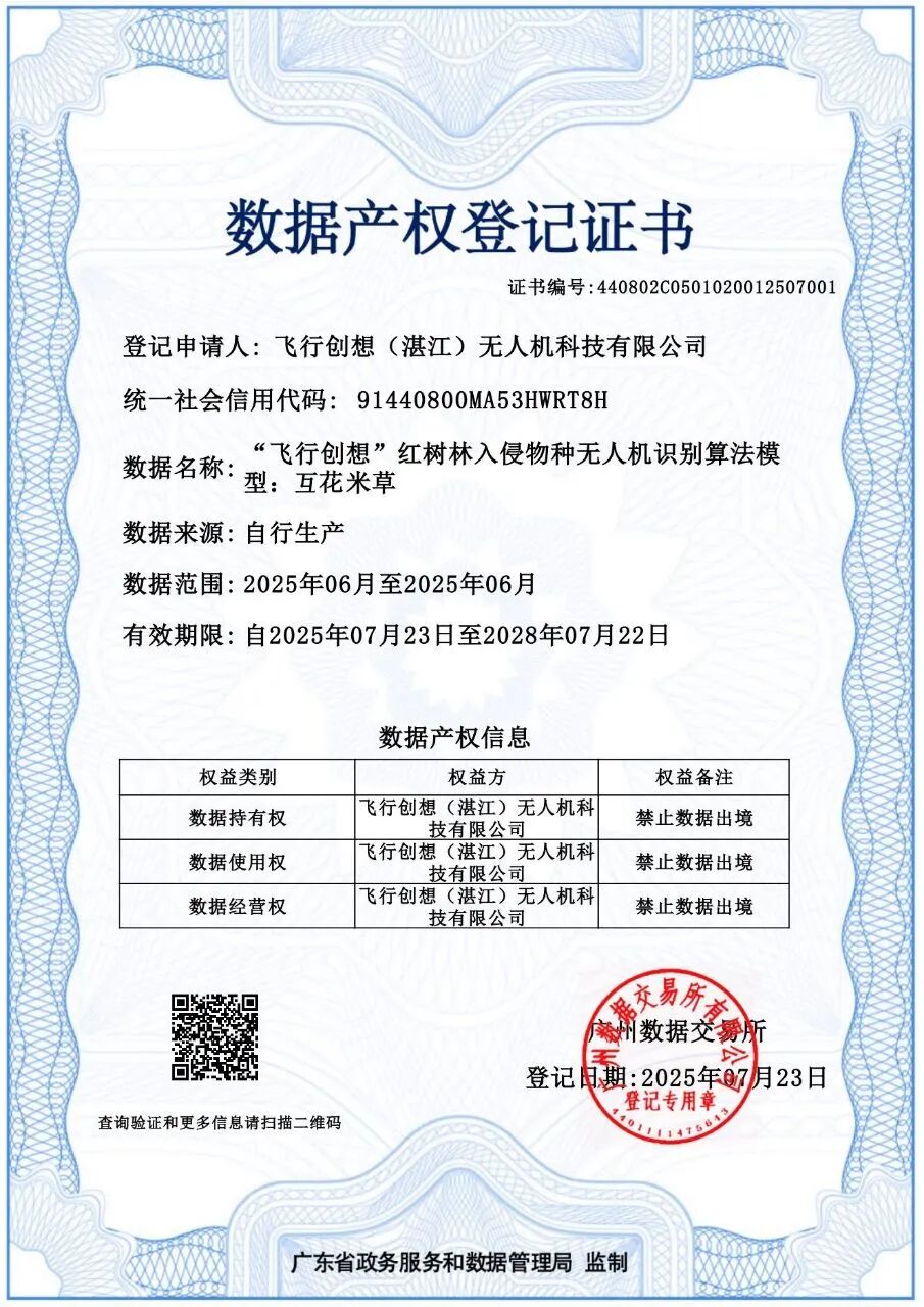 据了解,此次“‘飞行创想’红树林入侵物种无人机识别算法模型”在广州数据交易所完成数据产权登记,意义重大。这一登记不仅明确了算法模型的产权归属,为其推广应用提供了公信力保障,更标志着湛江在“人工智能+生态保护”领域的技术创新成果迈出了规范化、市场化的重要一步。