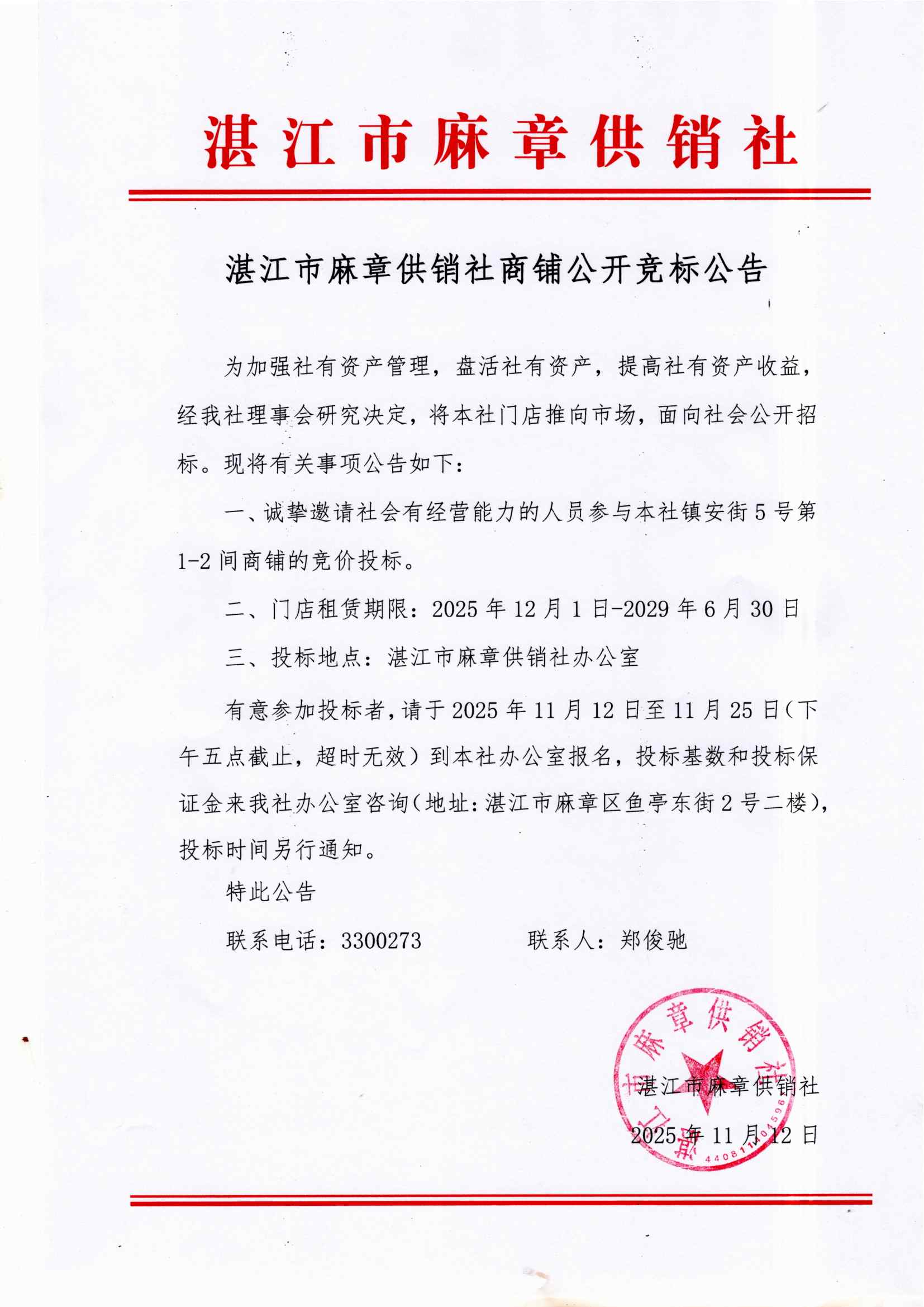 门店(仓库)公开竞价招租公告
