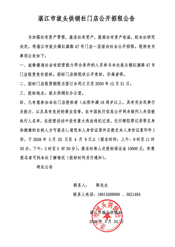 湛江市坡头供销社门店公开招租公告