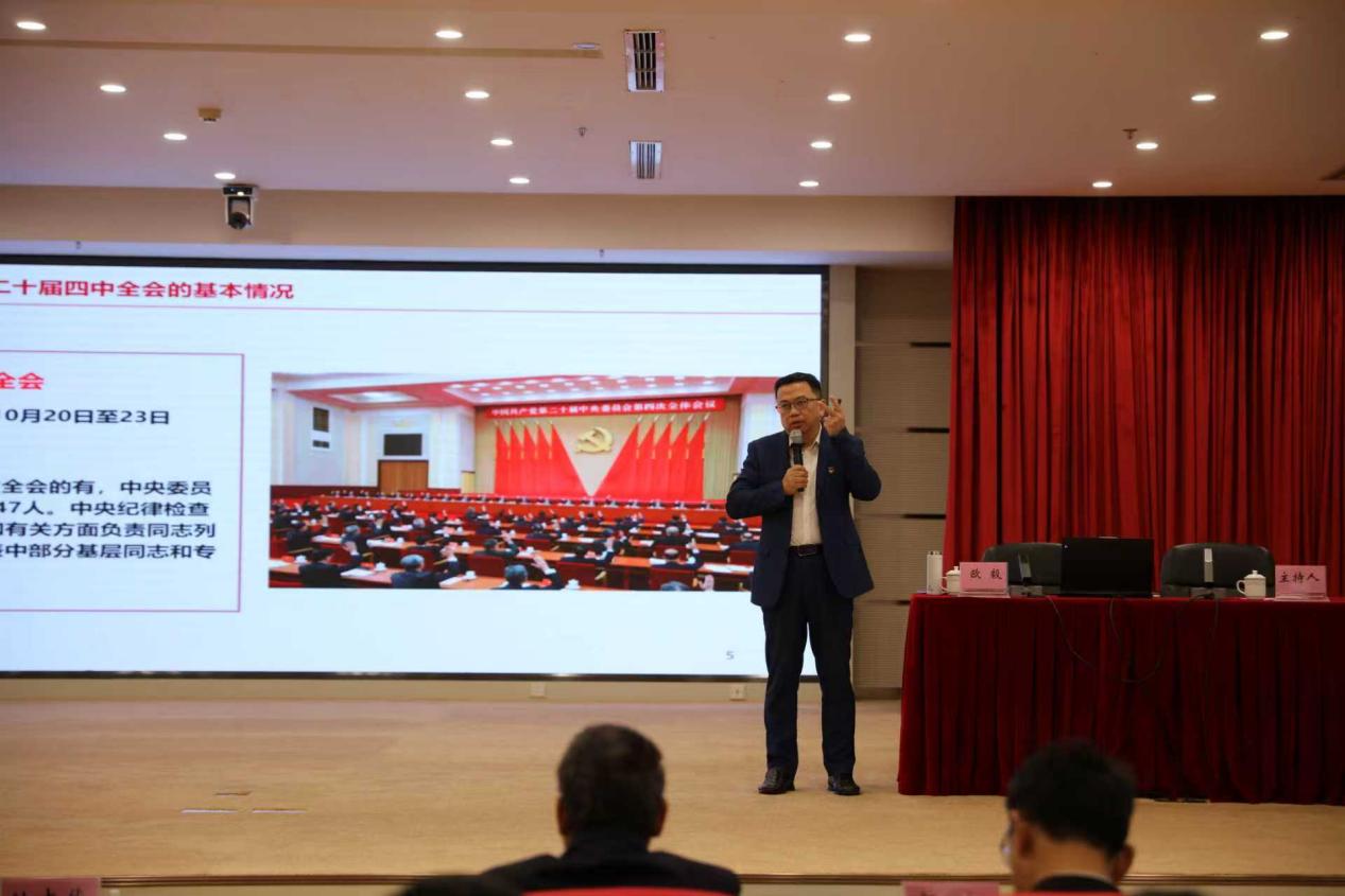宣讲中,欧毅教授紧扣党的二十届四中全会报告核心要义,以通俗易懂的语言深入浅出阐释全会精神,从“充分认识学习贯彻全会精神的重大意义”“深刻把握全会精神的七个关键问题”“扎实推动全会精神落地落实”三个维度展开系统讲解。报告立足宏观视野,融入微观实证,通过详实的数据支撑与鲜活的典型案例,对全会精神进行了全面解读和深刻剖析,不仅深化了全体参会人员对全会精神的理解与把握,更提振了大家干事创业的信心决心,激发了投身国企改革发展实践的澎湃热情。
