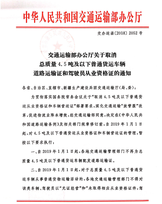 交通运输部办公厅关于取消总质量4·5吨及以下普通货运车辆道路运输证和驾驶员从业资格证的通知