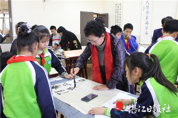 活动伊始,书法家为麻章区第三小学书法班学生授课,生动讲解了毒品的危害以及汉字源远流长的历史。随后,书法家们现场指导学生完成禁毒书法作品(如图,记者林石湛摄),学生们紧扣禁毒主题运笔挥毫,书写拒毒决心。一幅幅笔势有力、灵动舒展的书法作品让校园满溢翰墨之香,营造了浓厚的禁毒拒毒氛围。(湛江日报 记者陈荔雅)