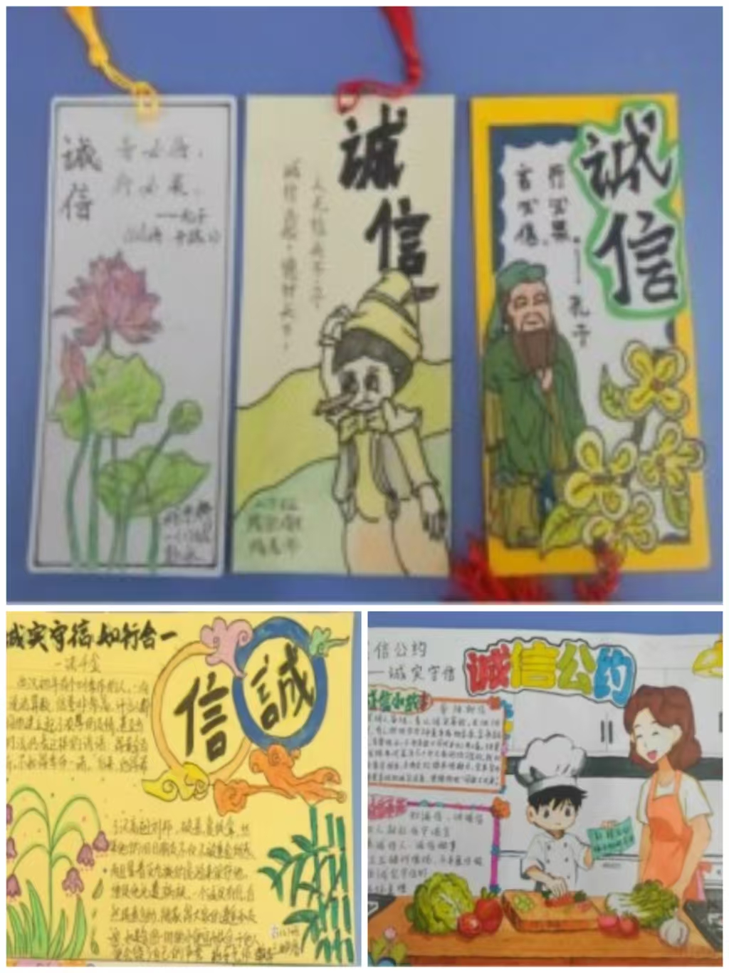 针对不同年级学生特点,设计不同的诚信主题特色活动,分别是诚信书签制作、诚信故事卡、诚信公约手抄报。其中, 1-3 年级学生开展诚信书签制作活动,学生创作的独具匠心的书签,既是用艺术语言诠释诚信的生动体现,也是向身边人传递诚信正能量的重要媒介; 4-6 年级学生开展诚信故事卡创作活动,既丰富诚信教育形式,也让学生深刻感受 “诚信就在身边”,促使学生们能以实际行动践行诚信、成为诚信精神的传递者; 7-9 年级开展诚信公约(手抄报)制定活动,帮助学生将对诚信的认知与认同转化为日常践行的实际行动。