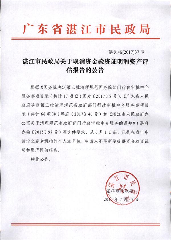 湛江市民政局关于取消资金验资证明和资产评估报告的公告