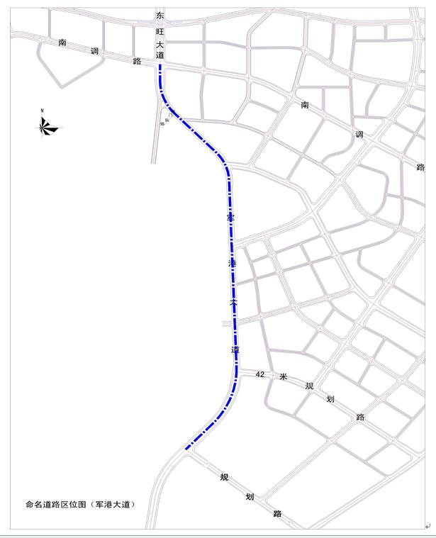 根据《广东省地名管理条例》的有关规定,经市政府研究同意,现对市规划局关于海东新区东旺大道一段市政道路更名为军港大道。军港大道北起南调路,南至规划路,道路长度约3.12千米,宽度分别是60米、36米(其中北起南调路,南至部队门岗路段宽度为60米;北起部队门岗,南至42米规划路路段宽度为36米;北起42米规划路,南至规划路路段宽度为60米)。 特此公告。