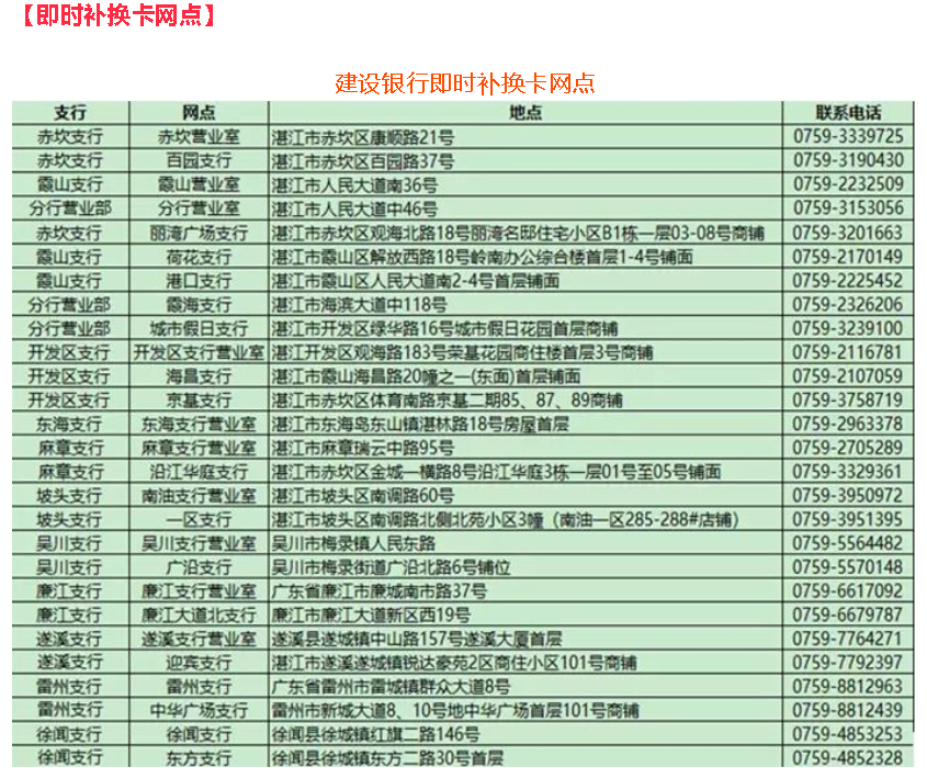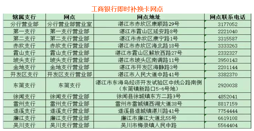 据统计,目前我市已开通即时发卡的银行网点共53家。其中,即时新办卡网点12个,可同时支持即时补换卡业务办理,由农业银行、湛江农商行提供服务;即时补换卡网点53个,由建设银行、工商银行、农业银行和湛江农商行提供服务。