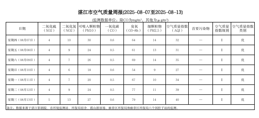 湛江市空气质量周报(2025-08-07至2025-08-13)