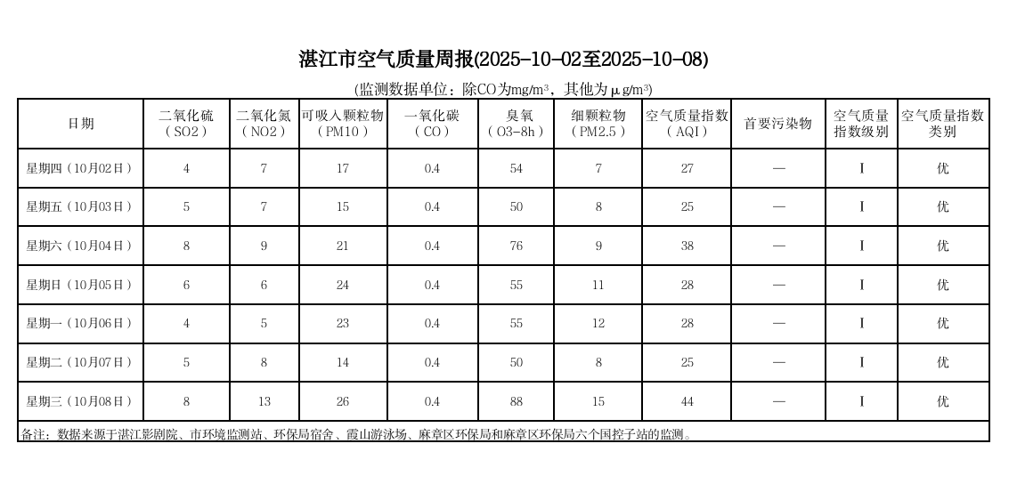 湛江市空气质量周报(2025-10-02至2025-10-08)