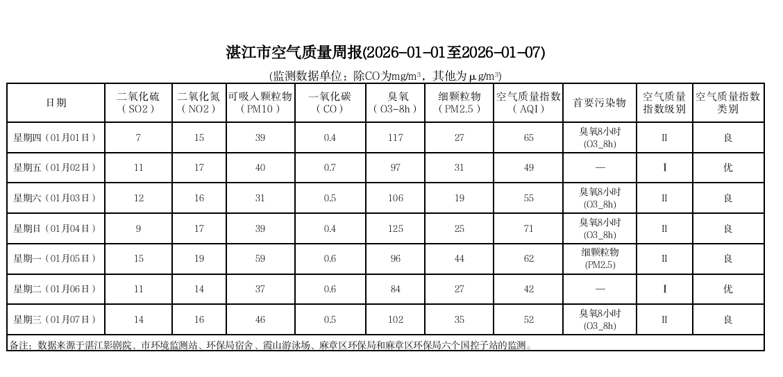 湛江市空气质量周报(2026-01-01至2026-01-07)