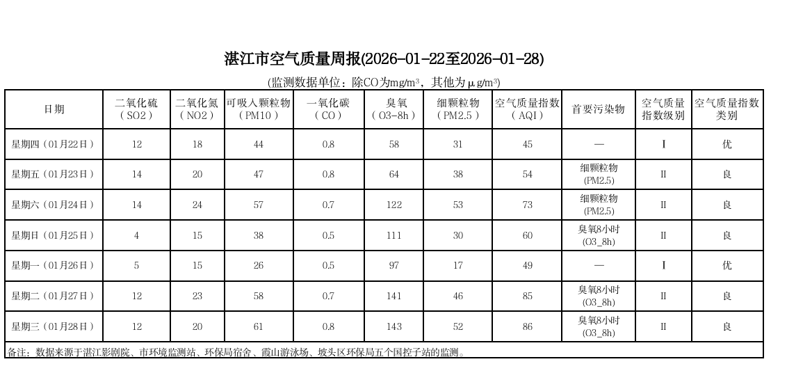 湛江市空气质量周报(2026-01-22至2026-01-28)