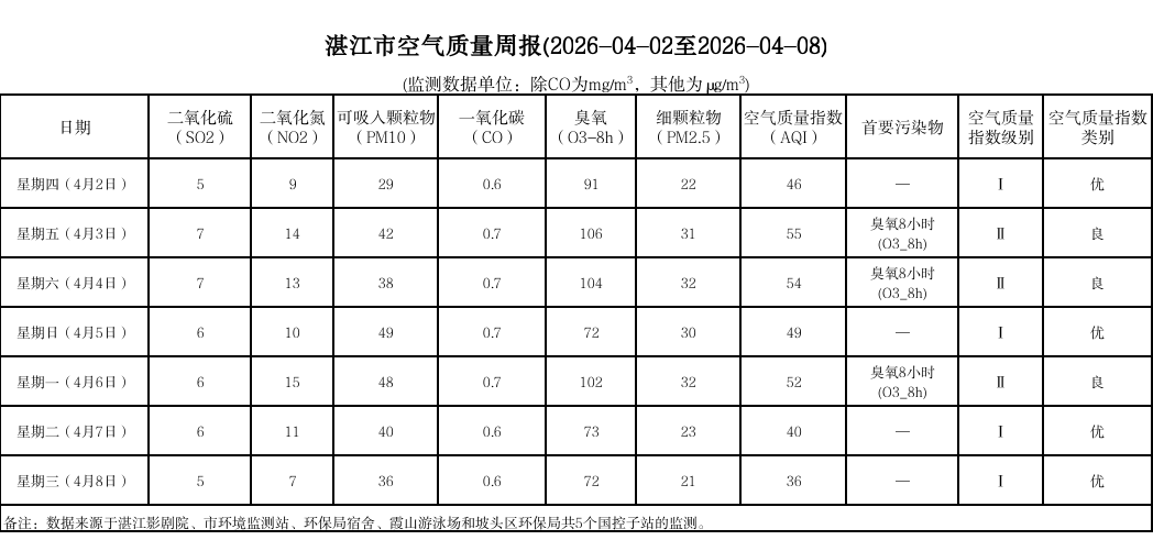 湛江市空气质量周报(2026-04-02至2026-04-08)