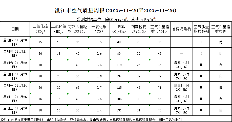 湛江市空气质量周报(2025-11-20至2025-11-26)