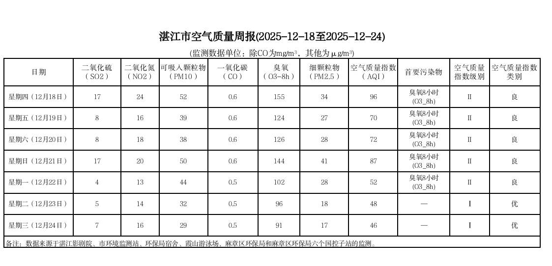 湛江市空气质量周报(2025-12-18至2025-12-24)