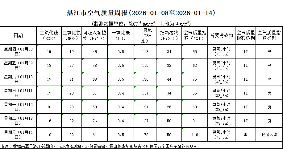 湛江市空气质量周报(2026-01-08至2026-01-14)