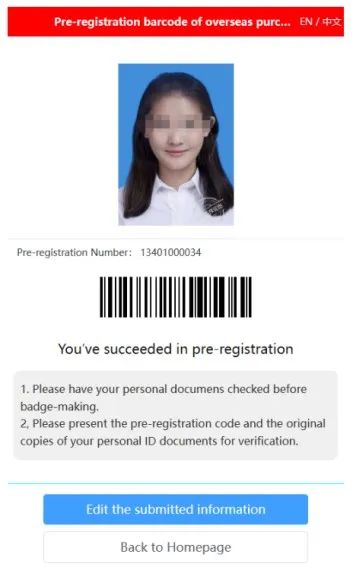 方法一:请扫描下方预注册二维码获得电子回执,适用于申请首张证件、因丢失或忘记携带采购商证申请补办,以及因个人原因申请更换证件。