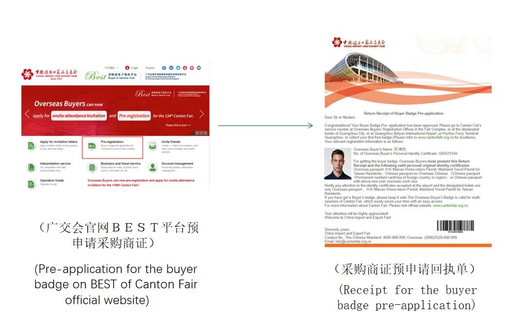 方法二:登陆广交会官方网站BEST平台(https://invitation.cantonfair.org.cn/),选择“预注册”,成功预申请后获得采购商证预申请回执单。适用于申请首张采购商证。