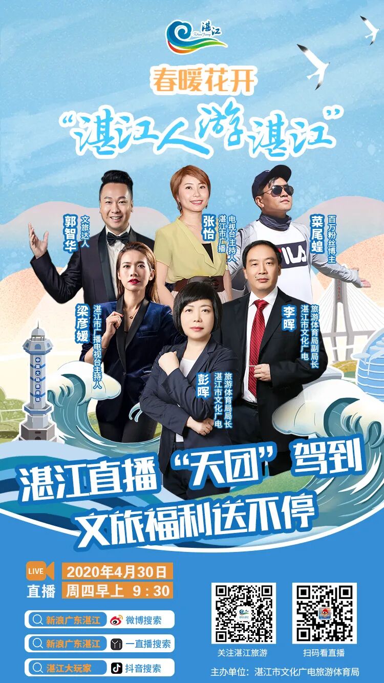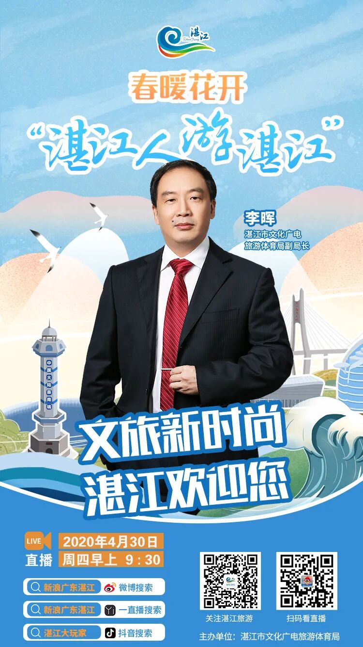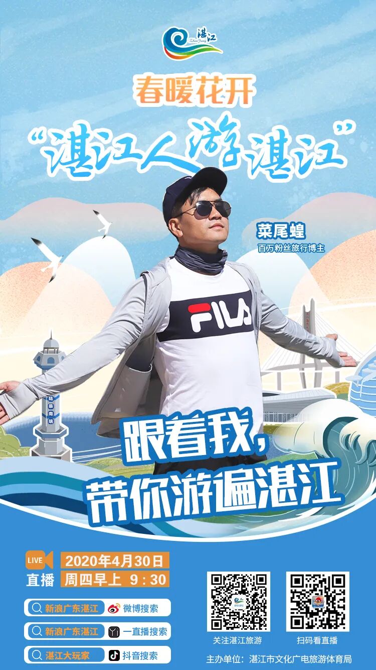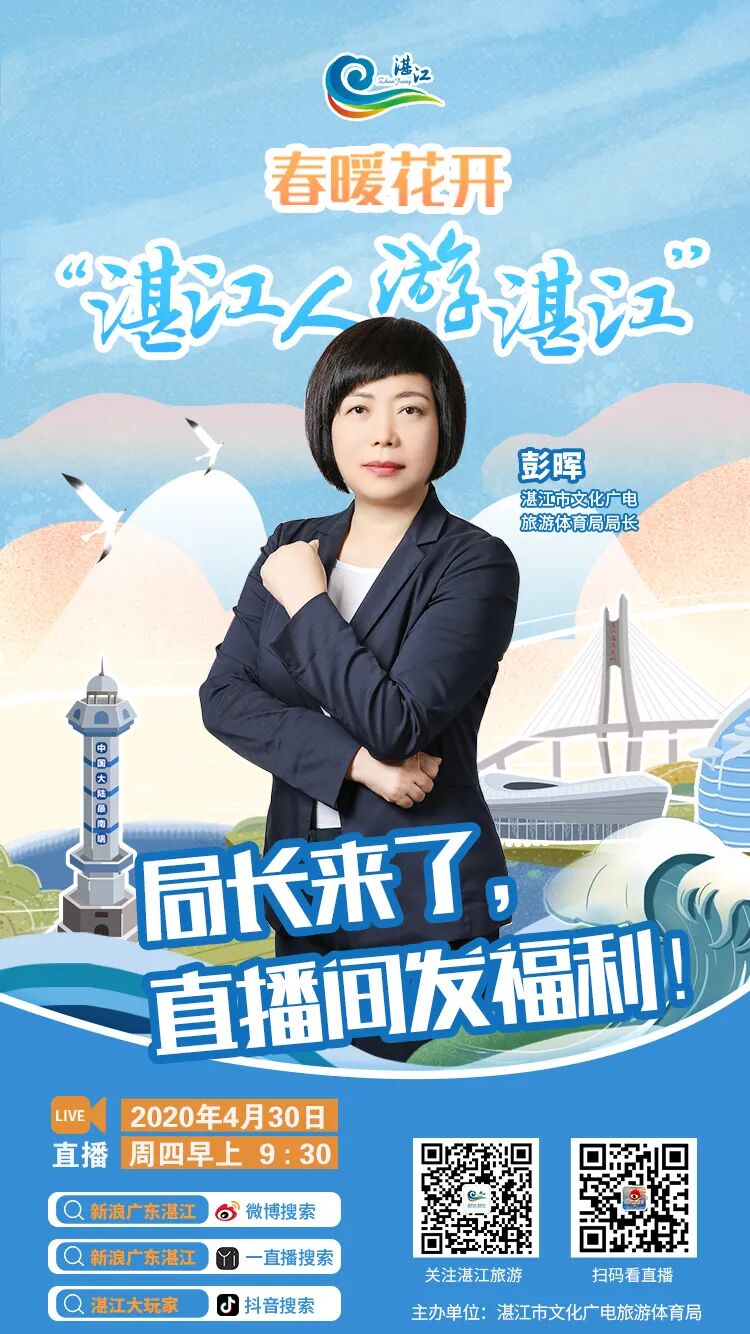 直播预告 主题:“春暖花开 湛江人游湛江” 时间:4月30日(本周四)上午9:30 观看直播方式:扫描上方海报直达直播间