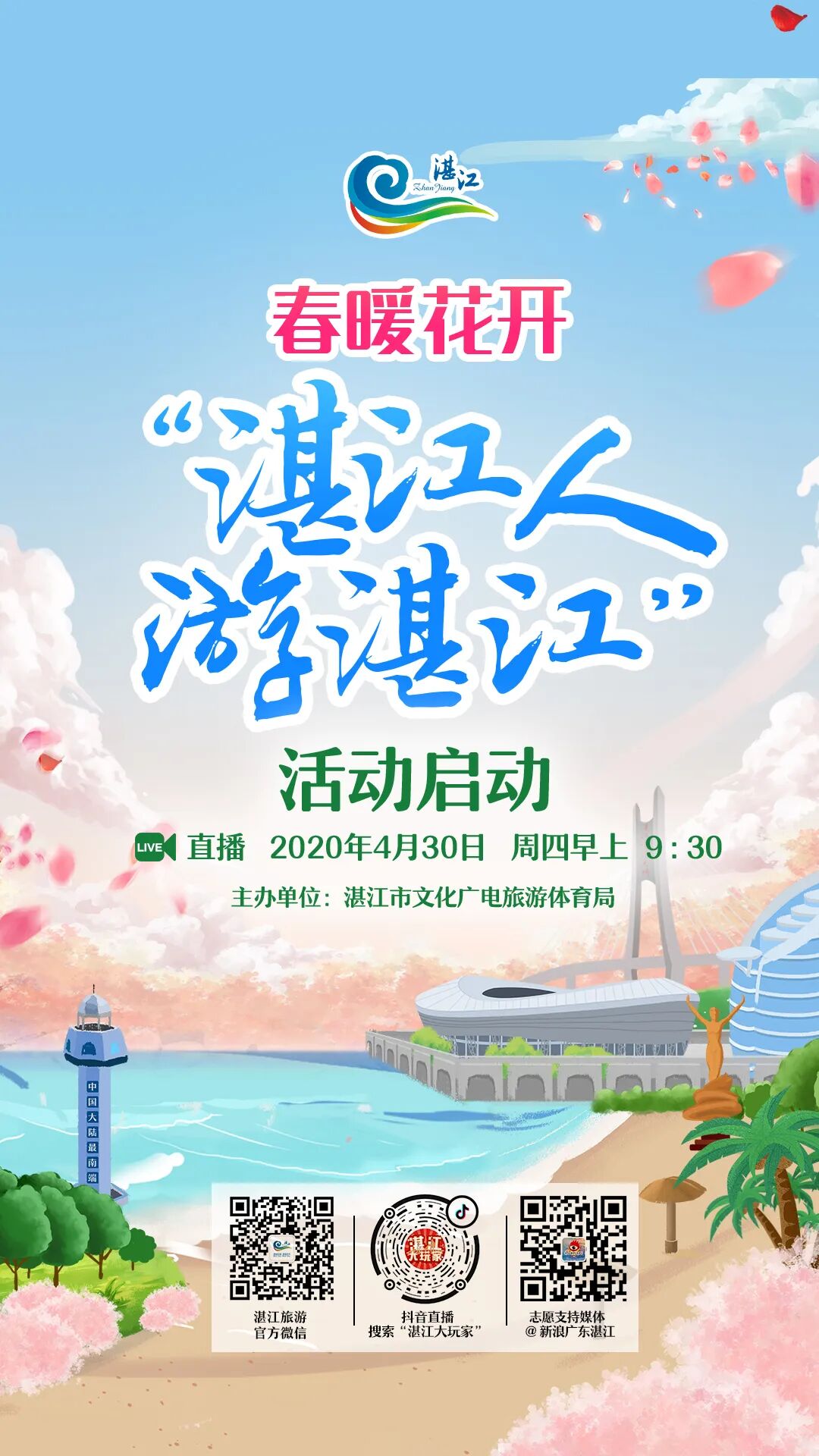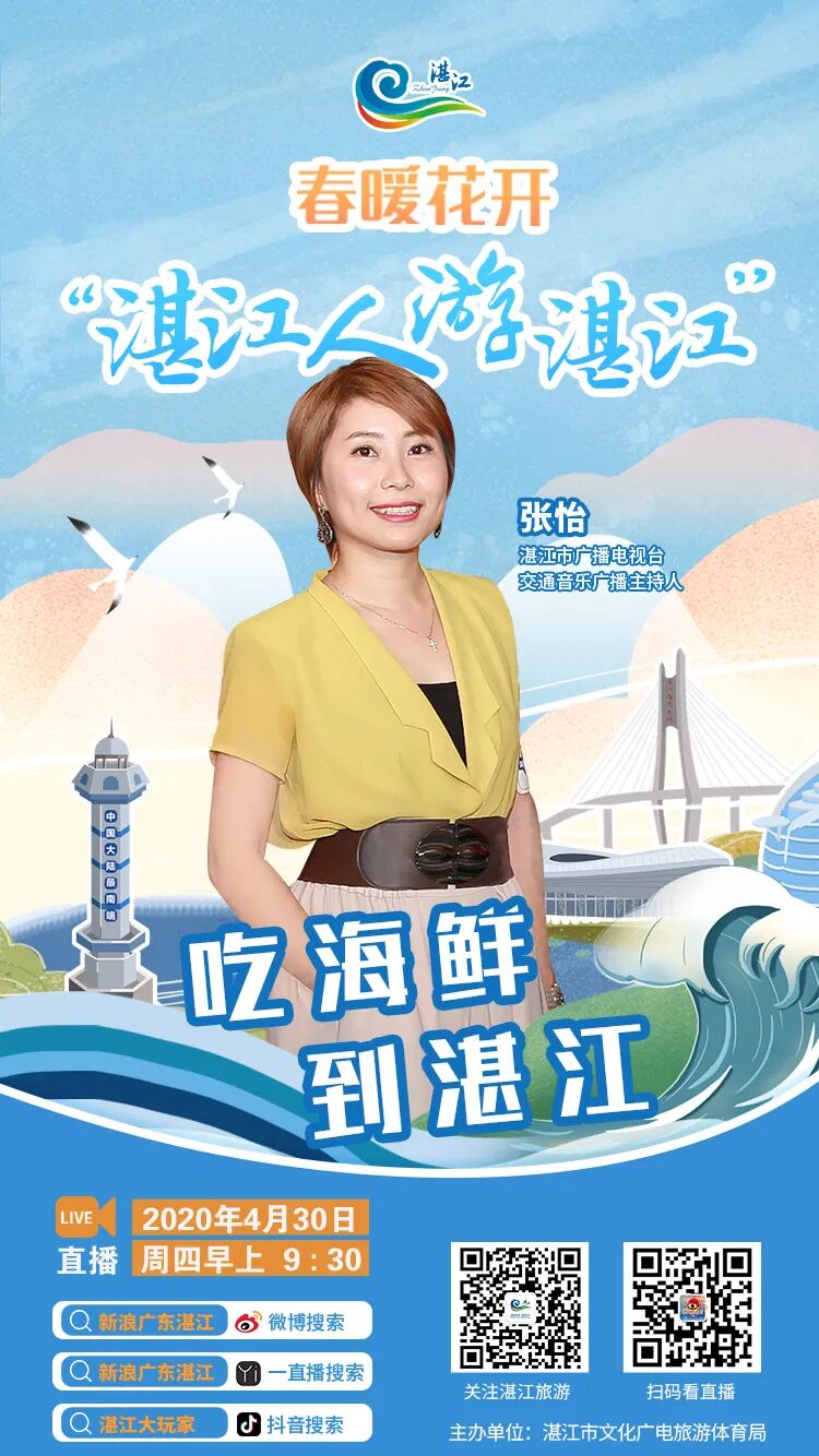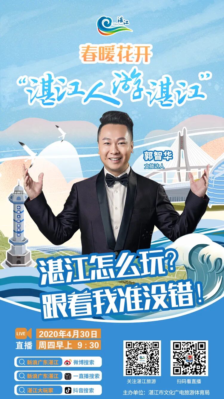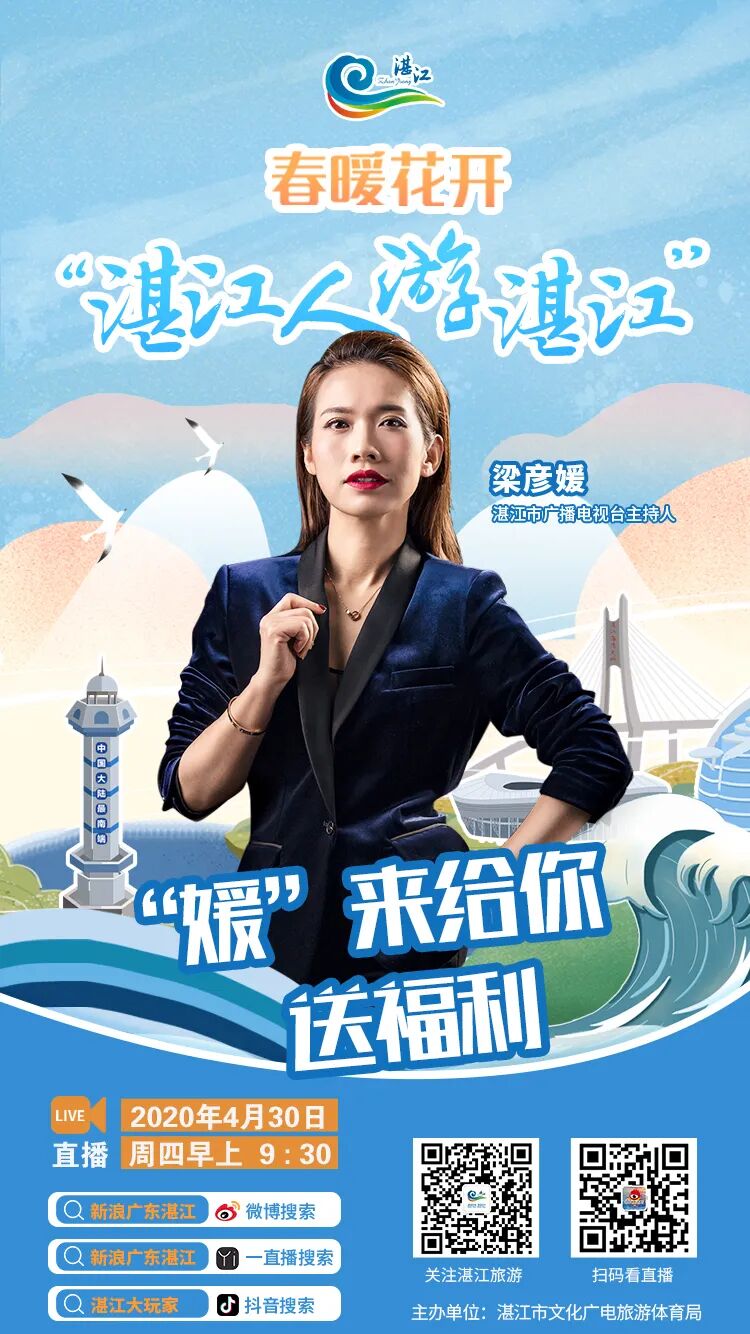 直播预告 主题:“春暖花开 湛江人游湛江” 时间:4月30日(本周四)上午9:30 观看直播方式:扫描上方海报直达直播间