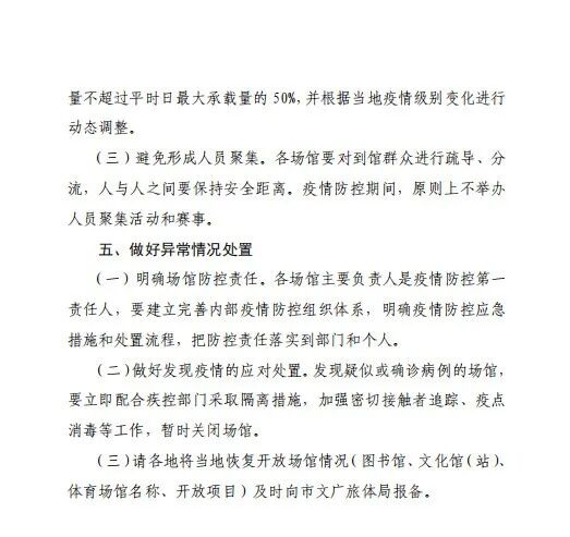 结合各地疫情防控实际情况和公共文体场馆的性质特点,按照“属地负责、风险可控、分级分类、有序推进”的原则,各县(市、区)文化体育主管部门对公共文体场馆是否具备开放条件进行研判,经属地党委政府批准后,做好疫情防控的同时,公共文体场馆可有序恢复开放。室内恢复开放的公共文体场馆,要提前做好预案,制定科学可行的具体措施,并根据当地防疫级别变化进行动态调整。场馆及邻近区域出现病例的暂不恢复。室外的人员聚集性文体场馆如篮球场、足球场、排球场等继续关闭,其它室外无身体接触、非人员密集活动场地可有条件开放。按照当地要求做好员工健康管理,掌握员工出行轨迹等情况,对去过疫情严重地区的人员实行居家隔离观察。员工入馆(站)前要检测体温,出现发热、呼吸道症状时,要及时报告。员工应减少不必要外出,避免去人群聚集场所;在人员密集的地方及开放场地服务的人员,必须按照《不同人群预防新型冠状病毒感染口罩选择和使用技术指引》要求,正确佩戴口罩等防护用品,注意个人卫生。加强员工用餐管理,实行错峰就餐,有条件时使用餐盒、分散用餐。减少召开会议,必须召开的会议要缩短时间、控制规模,参会人员佩戴口罩并保持安全距离。对外开放的室外公共文体场所须在入口处设置醒目标识,不聚集、不扎堆,确保人与人之间距离达2米以上,佩戴口罩,推荐使用绿色健康码。各场馆要根据实际,分区域分项目逐步恢复开放,对不符合开放条件的场地以及容易形成人员聚集的项目等,应暂不开放。各室内场馆要配备口罩、手套、消毒液、洗手液等防护物资,为员工和到馆群众提供必要防护保障。各场馆要保持通风状态,在条件允许情况下首选自然通风。如使用空调,应当确保供风安全充足。各场馆的阅览室、文化活动室、展览厅、会议室、报告厅、运动场地、餐厅、卫生间等区域以及图书期刊、自助借还机、演出器材、展览设备、运动设施等,要进行定期消毒。各场馆通过设置提示牌、LED显示屏播放、室外活动场地设施主入口醒目位置张贴横幅等多种方式,加强疫情防治知识科普宣传,使员工和到馆群众充分了解掌握防治知识、支持配合防控工作。各级公共文体场馆在逐步恢复场馆服务的同时,要继续通过数字平台,加强内容更新,为群众提供优质公共数字文体服务。各场馆要安排专人对所有进出通道严格管理,对进入人员进行登记;确保进入人员佩戴口罩,并在入口处接受体温检测,体温正常方可进入;体温超过正常温度的,应禁止其入内并及时上报疫情防控部门。各场馆可视情况实行实名预约服务,推广文体场馆采取线上预约、购票、电子支付等做法。结合防控工作需要,对每日入馆人数进行总量控制,室内文体场馆日接待量不超过平时日最大承载量的50%,并根据当地疫情级别变化进行动态调整。各场馆要对到馆群众进行疏导、分流,人与人之间要保持安全距离。疫情防控期间,原则上不举办人员聚集活动和赛事。 各场馆主要负责人是疫情防控第一责任人,要建立完善内部疫情防控组织体系,明确疫情防控应急措施和处置流程,把防控责任落实到部门和个人。发现疑似或确诊病例的场馆,要立即配合疾控部门采取隔离措施,加强密切接触者追踪、疫点消毒等工作,暂时关闭场馆。请各地将当地恢复开放场馆情况(图书馆、文化馆(站)、体育场馆名称、开放项目)及时向市文广旅体局报备。