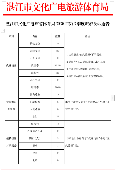 湛江市文化广电旅游体育局2025年第2季度旅游投诉通告